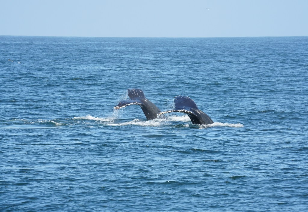 The third one in sequence would have been perfect except for missing a tip of the fluke. Darn. But I was thrilled with the other two. We spotted a large group of dolphins and followed them for a while, and humpbacks were spouting and diving all over the place. After 3 hours or so, we finally headed back to the harbor. My hand was cramping by then from holding the heavy camera.