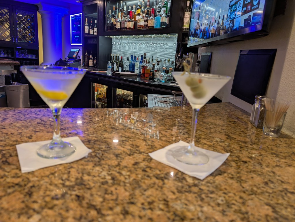 My plans for that evening were pretty simple – dinner at the hotel bar, and a martini toast for my wife. I asked the bartender for my usual dry vodka martini, and to make a lightly dirty martini, my wife’s favorite, which I’d keep to the side. When I explained why, she had everyone at the bar toast to my wife’s memory. Nice. Made me cry a bit. I wound up talking to a lot of folks at the bar, and to the bartender for a few hours – turned into a nice celebration of sorts.
