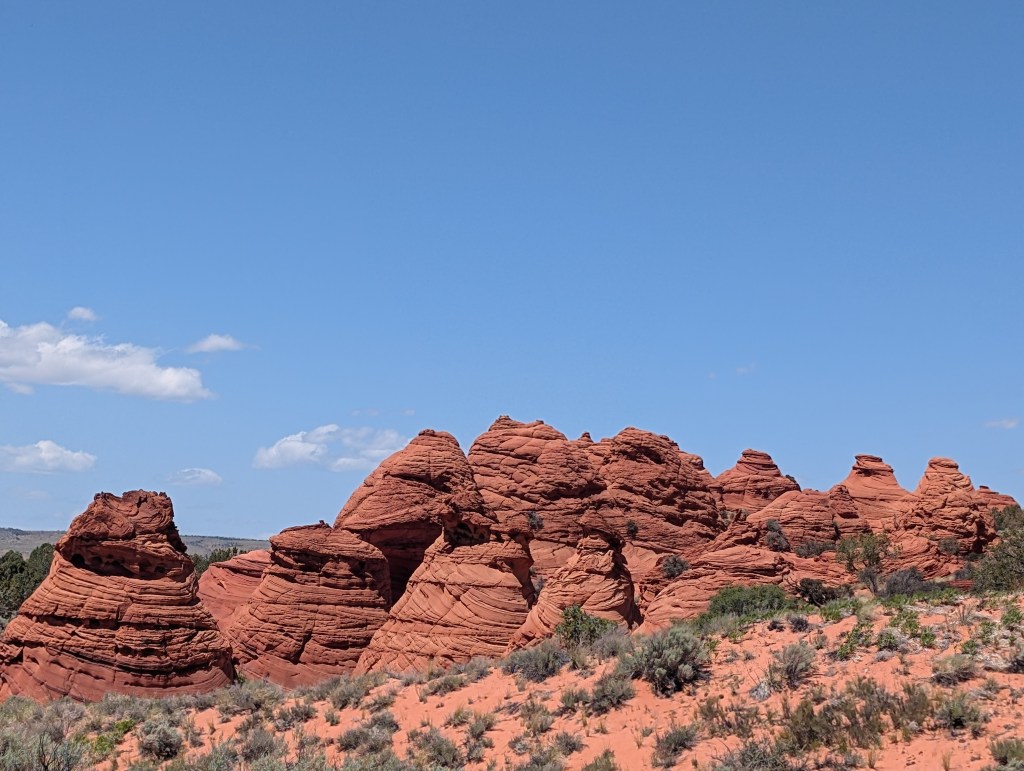 We spent over two and half hours, just taking our time to cover the entire formation. Probably walked 2 or 3 miles. The weather was great, nice and cool, but extremely windy. After a while, it was becoming dangerous for me (those balance issues again), so we wandered back to the Jeep to begin the ride back. That too was fun – he followed a rough 4-wheel drive trail back to the main road which goes along the North and South Coyote Buttes areas, so I got to see the starting point for the Wave. We also passed by some “interesting” rock formations (picture below). Kind of look like the turd emoji, but are called teepees.