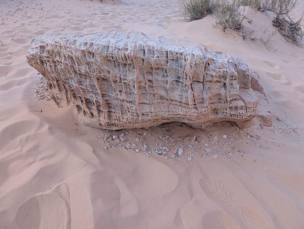 Since I still had a few muscles and tendons in my legs which were not screaming in pain from the abuse of this trip, I made two stops on the way back to Las Vegas. The first was the Coral Sand Dunes State Park, which was sort of on the way out from Kanab. The park is a sort of a misplaced beach, or from a geologic perspective, an example of how all the huge sandstone formations are created. Wind driven sand eroded from the Navajo Formation blows into this area and builds up against the ridge lines, creating very large dunes. It is a perfect playground for ATV’s and other off-road vehicles. You can also rent a surfboard and slide down the larger dunes. Looks like fun, but not for me. All of this activity is well controlled by the park rangers, so it’s safe to wander around to look for animal tracks, or just enjoy the scenery. I’ve mellowed about ATV’s in my old age I guess. It was a pleasant stop for an hour or so, but I did manage to get a pile of coral sand in the car. I had to do some serious vacuuming when I got home.