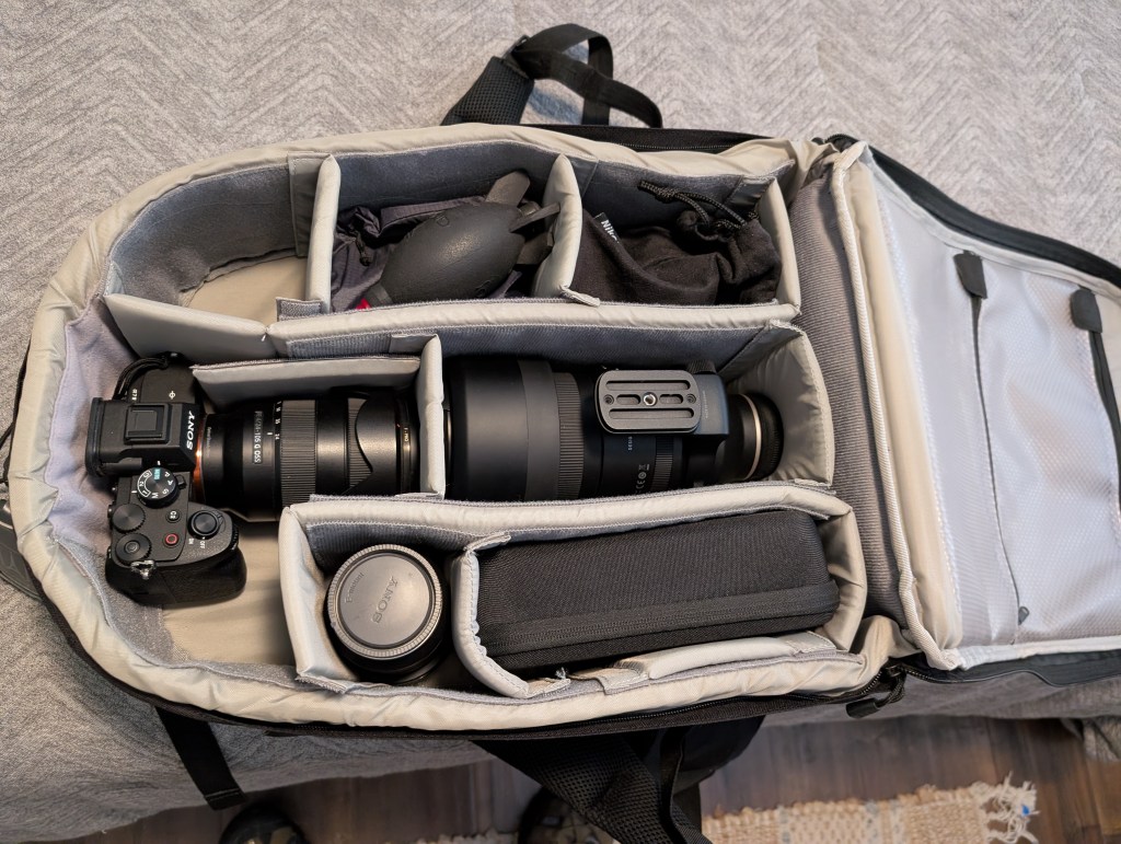 You have already seen photos of the camera gear I may bring along on a trip. As I mentioned, there is much more than just the cameras and lenses – there are lots of chargers, cables, extra batteries, memory cards, lens cleaning stuff – just a lot of extraneous but thankfully small objects that need to find a place somewhere in the luggage. I have four options now for packing camera gear in carry-on luggage: