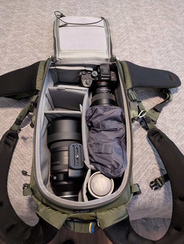 - A mid-sized back pack from Think Tank – this was the latest pack added to my collection, and can hold a limited amount of gear. If I bring the 500MM lens, I can fit one camera body, and maybe 2 other lenses. It also has limited space for the other stuff you like to bring along on carry-on luggage – meds, iPad, maybe a light sweater, batteries. I almost need to bring a second, small carry-on for that stuff. The proverbial small piece of luggage that fits under the seat in front of you. Where my big feet are supposed to go. As you can see in the photo below, there is a lot less room for gear in this pack – I can fit all the regular camera, gear, but not the GoPro case, and there is little room for extra stuff in the front pockets. But, it only weighs in at 14.5 lbs, and easily fits in any overhead compartment. Plus, I can use this as a pack for hiking.