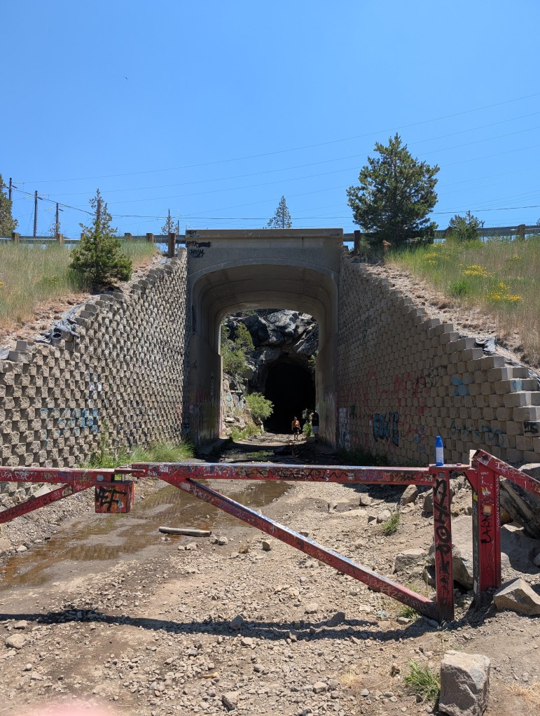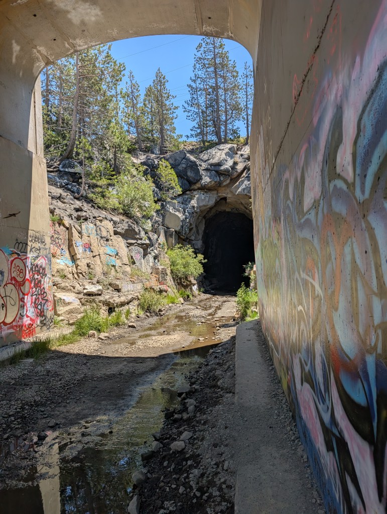 A bit of history – the Donner Tunnels (15 of them I think) were built in the late 1860’s by 1000’s of Chinese laborers, as part of the Transcontinental Railroad. They had to drill and blast through solid granite, build massive retaining walls, and probably lay the track as well. Aside from the rock tunnels, the railroad also constructed lengthy snow sheds to protect the tracks from deep snowfall and avalanches. Some of these are at least a mile long, and connect to the tunnels – these were originally wood, and were eventually replaced in the 1900’s by massive concrete structures. Pretty amazing engineering and construction techniques.