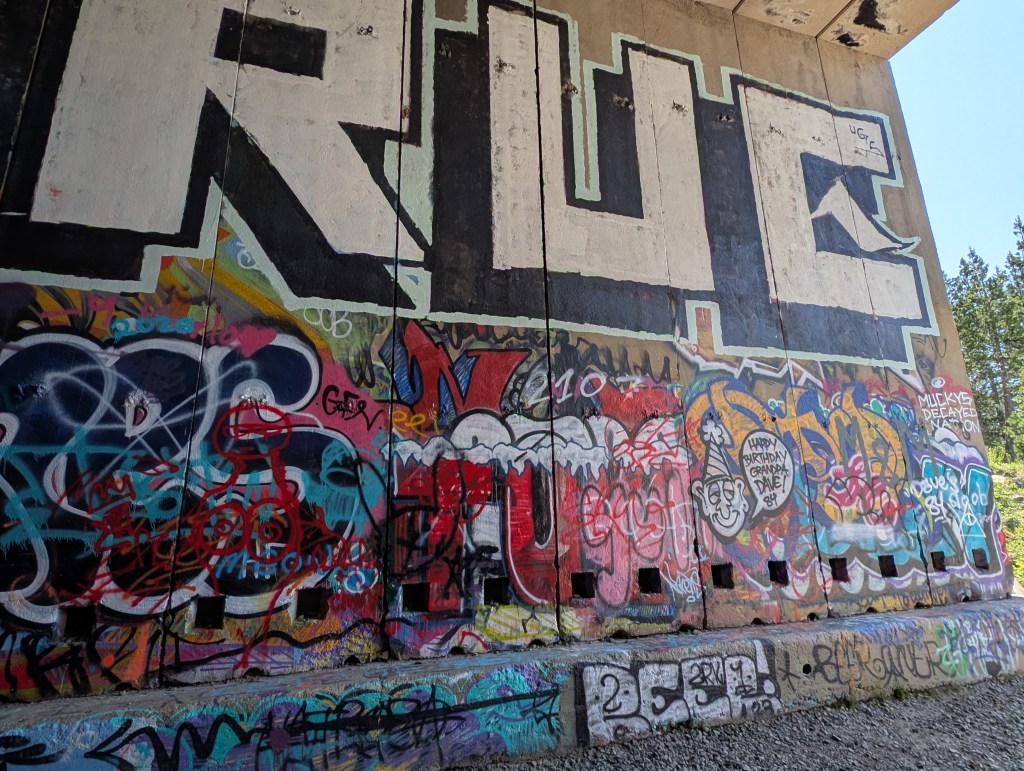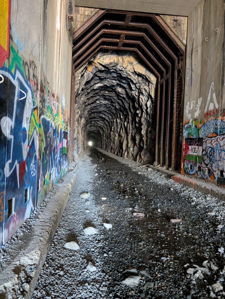 After Tunnel #6, it seems like the rest of the rock tunnels are short and dry, and have a snow sheds attached. This is where the graffiti really starts, more so at the end of the tunnels/sheds, but quite a bit through the lengths of the sheds as well. The concrete structures have openings for light and air through the length of each shed, so you do not need flashlights unless you are walking though the attached rock tunnel, and those are short. The openings provided enough light for the graffiti artists, so there is a lot of interesting works along the way.