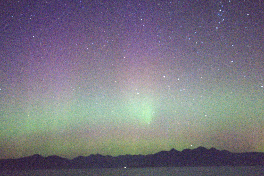 After that, we headed off North towards Glacier Bay, quite a ways off. We had reports that we should be able to see the Northern Lights that night. Even though I was already tired (more on that in a bit), I headed out to viewing area on the bow at 10:00 – it was cold and extremely windy, plus the ship was moving really fast. Looking off to the North, there was a glow of sorts over the mountains – not very exciting. For the dimmer Borealis displays, you need to take photographs to see the colors – I’m not sure why, but it worked. It was a real challenge trying to take photographs with a heavy wind and rocking boat, but I did get a few nice shots (which I’ll be working on with Photoshop).
