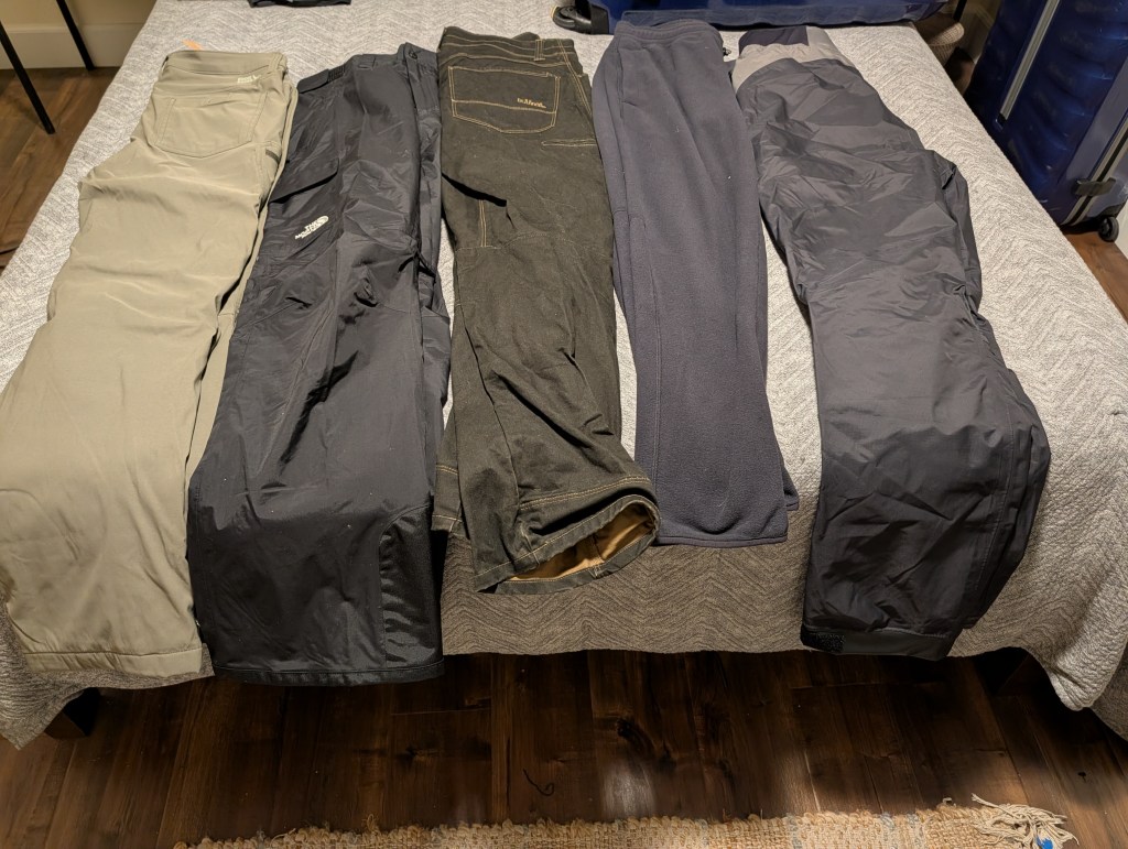 All the additional, required winter layers take up a lot of room in luggage. Insulated, waterproof pants are a must for most every activity. Those theoretically could be used for kayaking, but ski pants were not really designed for being immersed in water (which hopefully will not happen), so waterproof kayak pants are a better choice for that activity. And it would be nice to have something else to wear on board for evening gatherings. So that makes a minimum of three pairs of pants, other than what you wear for travel. I went a bit crazy shopping for this trip (hard to believe…it’s become a new hobby for me) – I bought North Face insulated pants, and a pair of fleece pants at the Colorado REI, and already had the kayak bottoms, and a pair of winter weight hiking pants that Jan bought me years ago. So that makes four for packing, although the fleece pants are also a thermal layer. And then I found a really nice pair of fleece lined pants, on sale, the other day. That would be overkill. Darn. I’ll save those for my January trip to Yosemite.