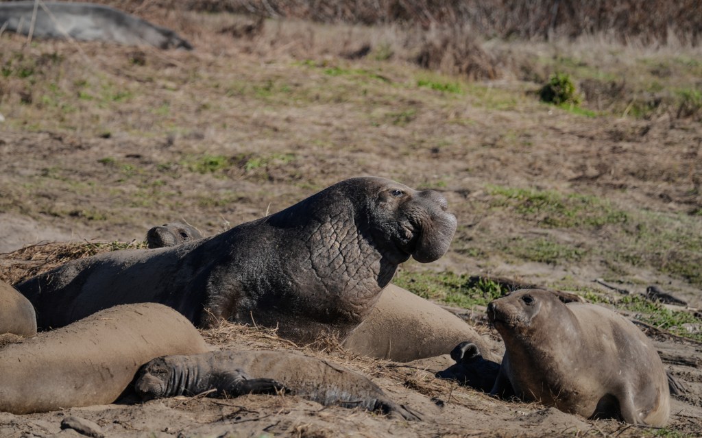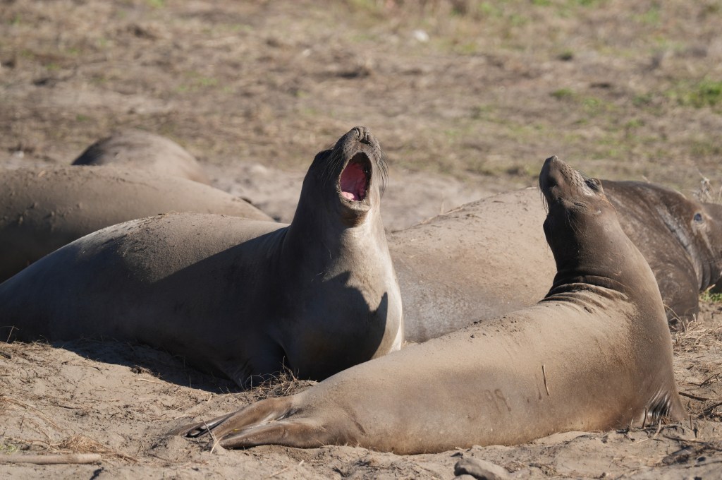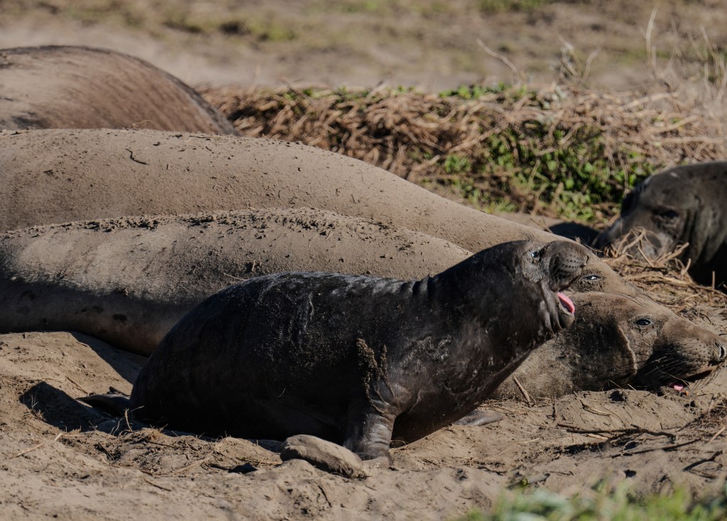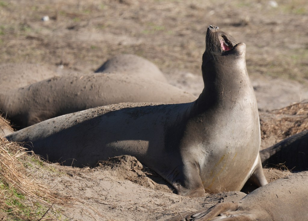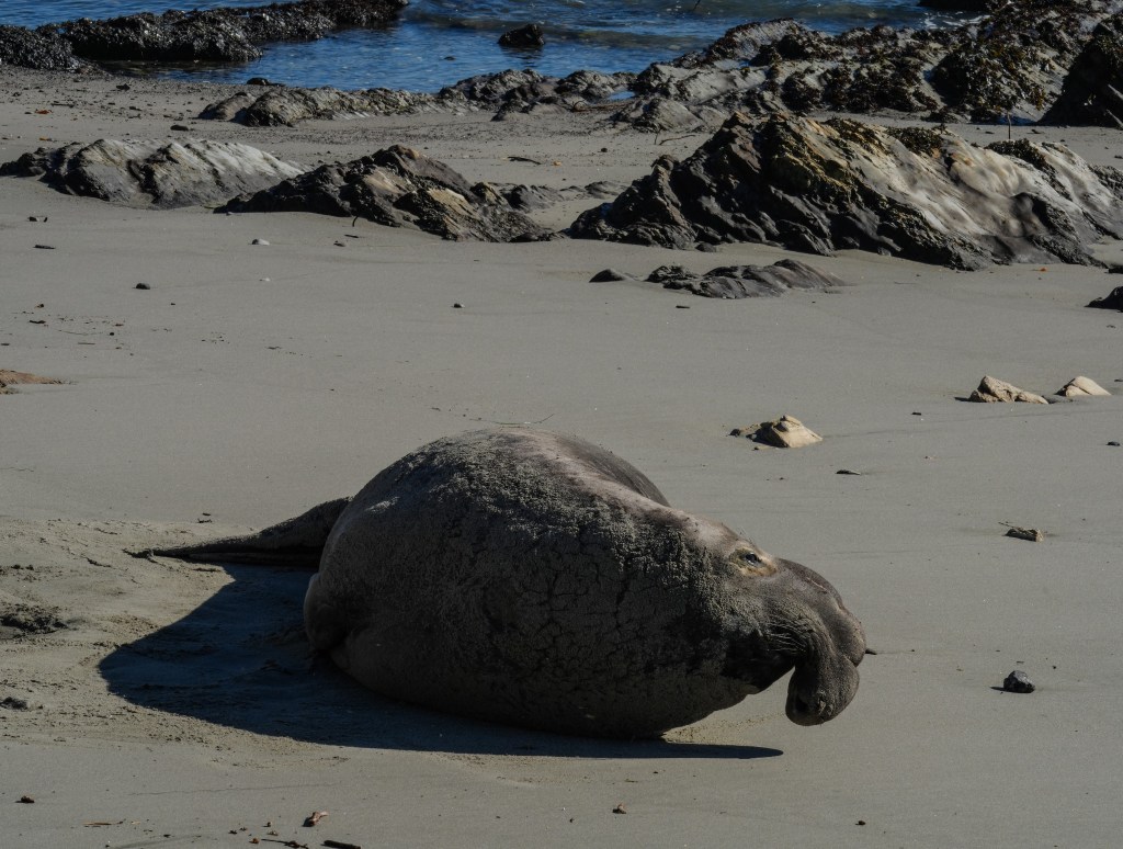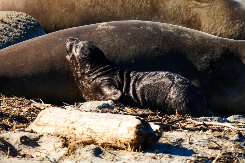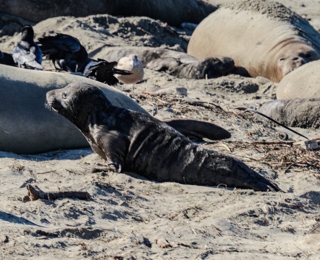 The docents take you the last 2 miles along the beach trails, which get you up close and personal with the seals. It’s pretty amazing. There are hundreds of male, female and newborns pups scattered around the beach, with some of the huge alpha males hauled up on the trails. It’s quite noisy with the big males trumpeting, and the pups all shrieking to be fed. From a photography viewpoint, it’s pure chaos. The seals are pretty much sand colored, except for the black pups, and they cover themselves with sand to maintain their temperature when the sun is shining. So most of what you see are masses of large, tubular, sand colored bodies lying on sand, and throwing sand on themselves.