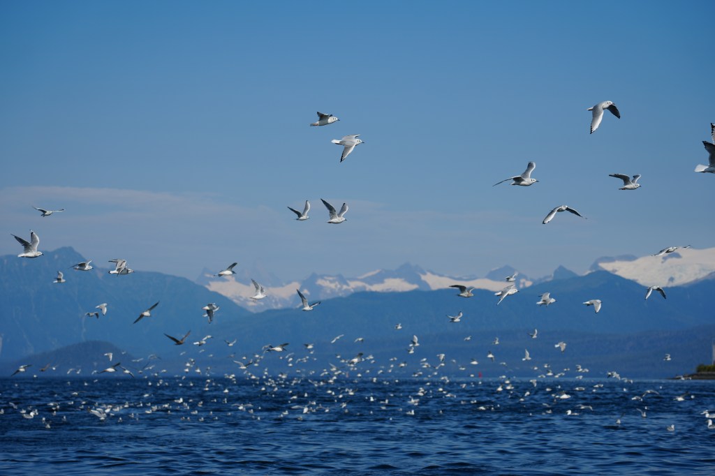 My knee held up OK on this hike, but I decided not to push my luck, and did swap out a second hike for the Zodiac tour of the harbor. That turned out well – I never knew much about commercial fishing boats, and we learned a lot from our boat driver (who was from the area). Now I know what a purse net is, and how it works. Important information for living in Sacramento. We also cruised through an extremely large flock of gulls (3 types) which hang around the fish processing plant, and checked out a rotting, abandoned fishing boat, and went by the processing plant where they suck out salmon from the boats. Quite the adventure.