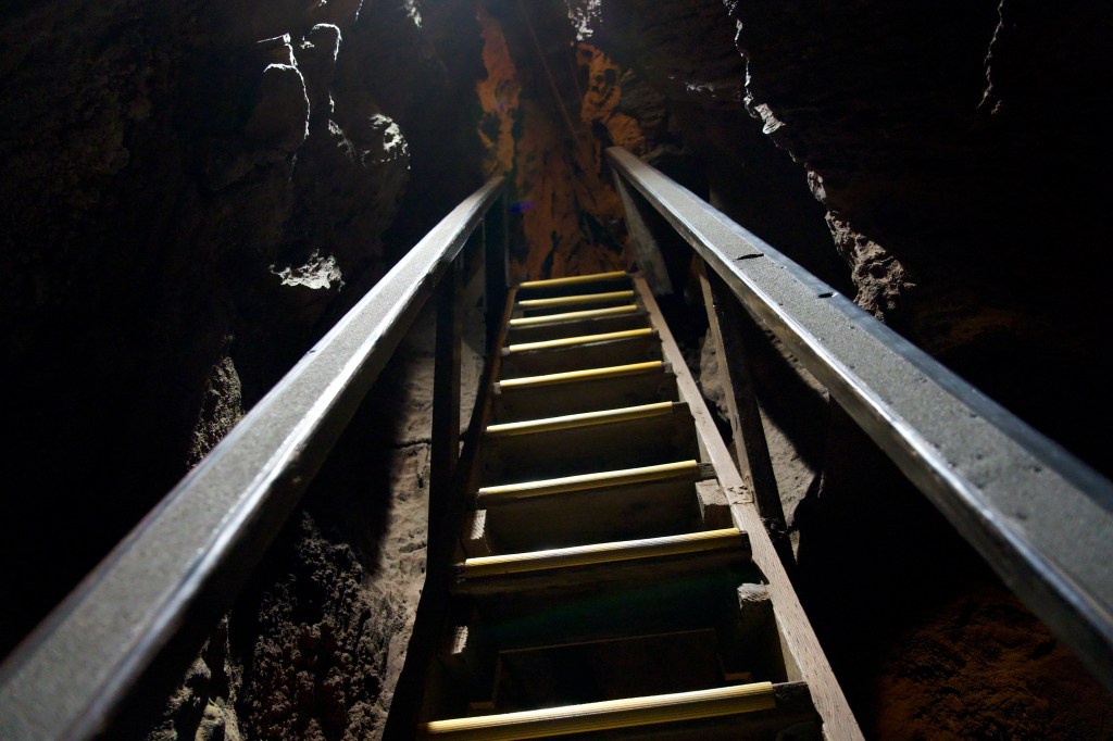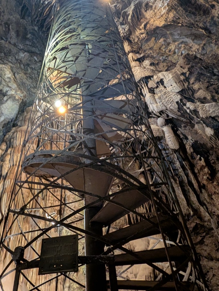 The stairs leading down were quite steep and narrow, and not as well lit as in some of the other caves, but with solid railings to hold on to. There were also a few tight spots where taller people have to duck to avoid smashing your head. There were four or five landings on the tour where we stopped and gathered to view some of the classic features you see most caves – stalactites and stalagmites, columns, various flow features. Each of these rooms were fairly small, but were well lit to highlite the features.