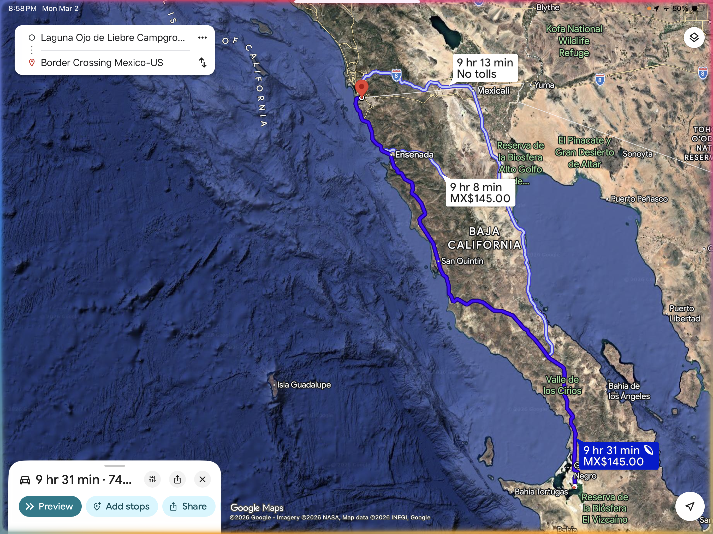 Google estimated it at nine and a half hours…that would be at night, when I generated this image. During the day, you have endless traffic in the small towns around Ensenada, then even more traffic getting through Ensenada, and even more traffic in Tijuana. And that just gets you to the border. So, I knew this was going to be a long haul.
