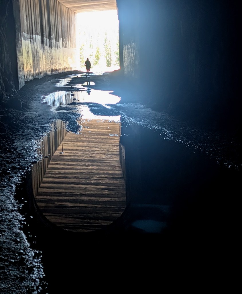 On my first hike, I covered tunnels 6-8, which included the long, dark tunnel at the head of the trail, and one very long snow shed. The remainder of the trail covers tunnels 9-11, which includes another long section of snow shed, and 2 moderate sized rock tunnels attached to snow sheds. All told, it’s about 3 miles from the parking lot to the end of the last tunnel. Nice, easy walking on rough gravel, with pools of water, and dimly lit trip rocks.