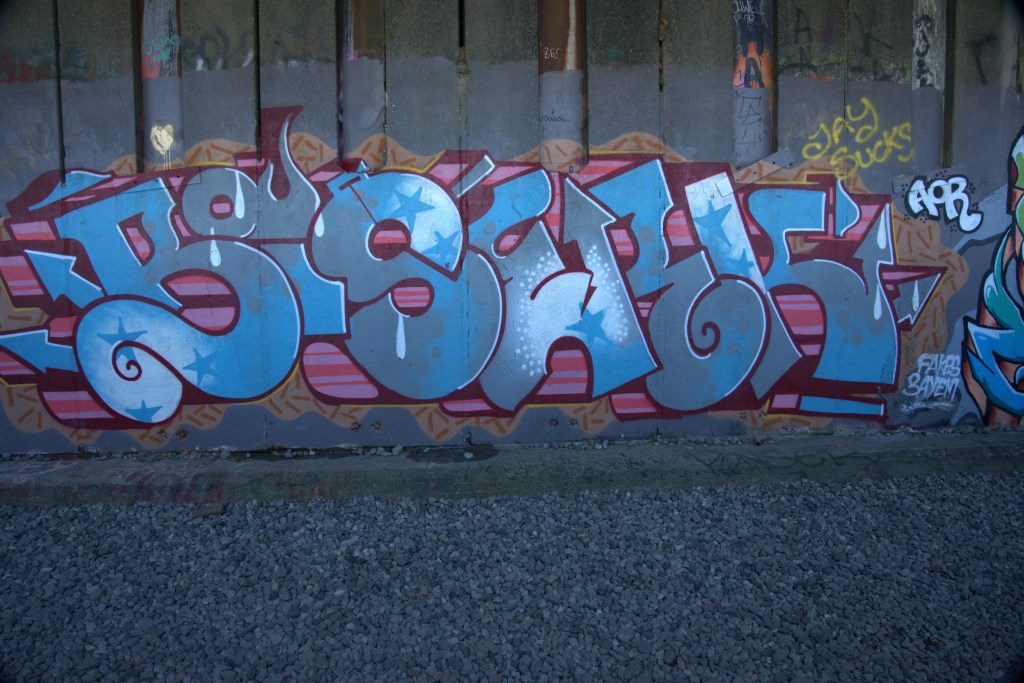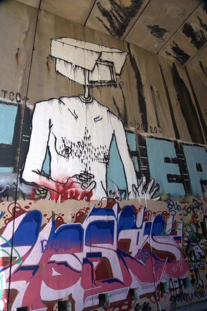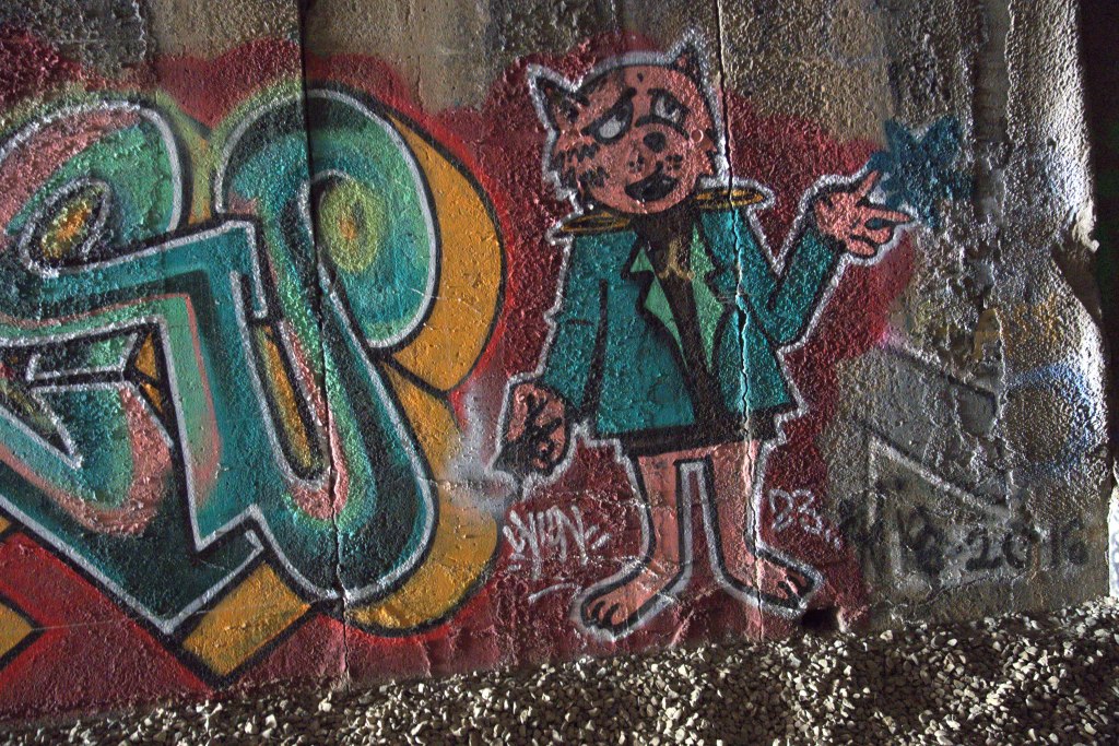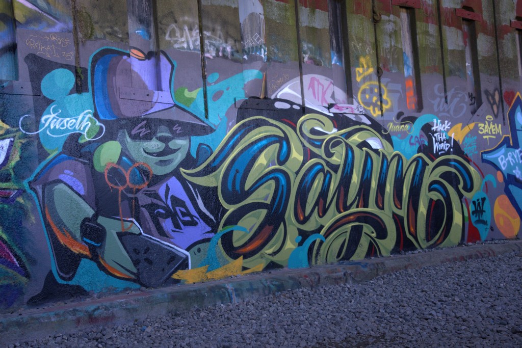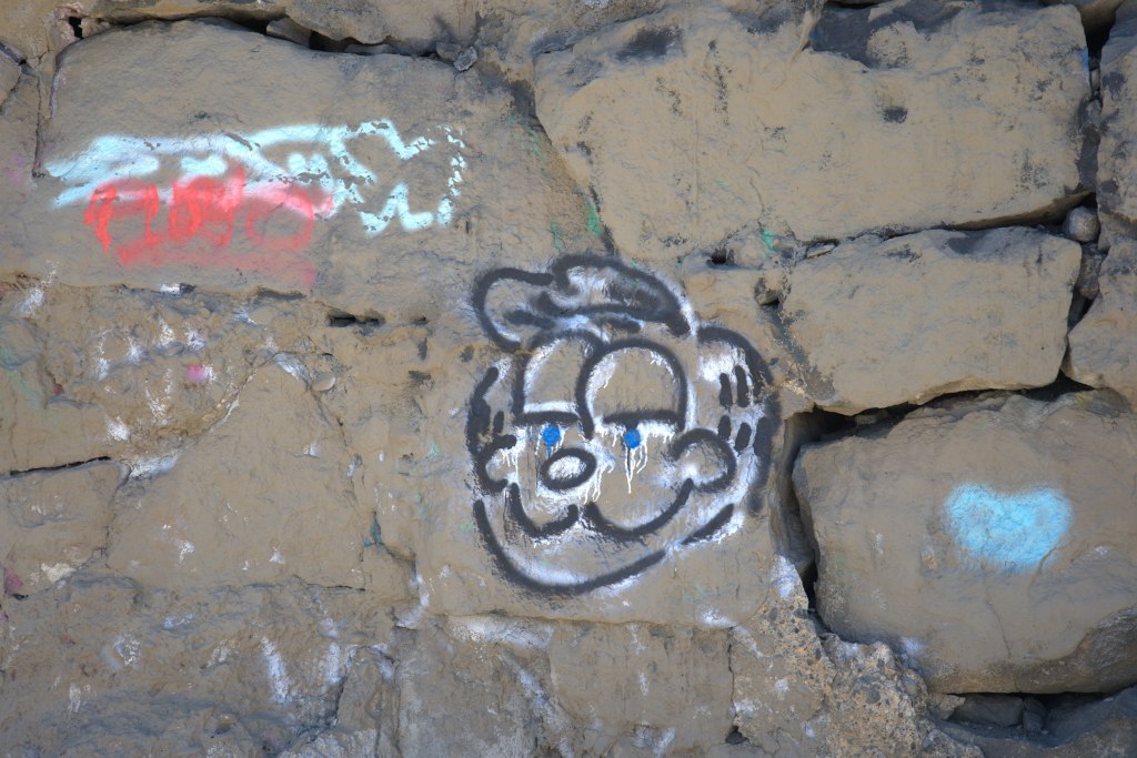 Other than completing the full six mile round-trip hike, my goal was to focus on photographing the street art. And whatever else seemed interesting. I had lured a friend interested in photography to come along, so off we went in the morning, with camera gear and lots of flashlights (some with new batteries this time). I did forget one important thing – the 250G SD card for my Sony A7. Fortunately, the camera has two cards, and the second was still in the camera. Near disaster for sure.
