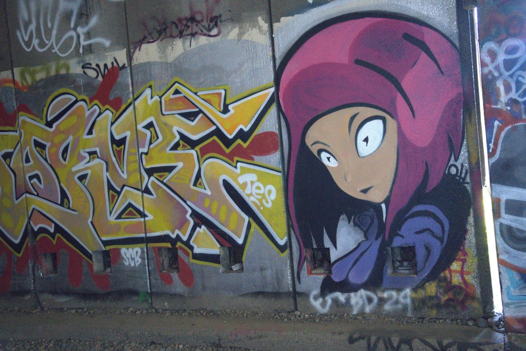 And now for the street art. There are some amazing murals throughout the tunnels, almost all painted in the snow sheds. There is a lot of graffiti in the tunnels, but most are just scrawls on the dimly lit, rough rock walls. I was amazed at how high up some of the art and graffiti was upon the concrete walls – a very large ladder would have been necessary to reach that high. Some of the murals must have taken a day or two complete – some had a base color painted across large sections of the walls. The artists clearly had a plan, and must have brought a lot of paint and equipment along, not just a few cans of spray paint. It’s a shame that so much of this work has been covered over with graffiti. You can see that on most of the photos below.