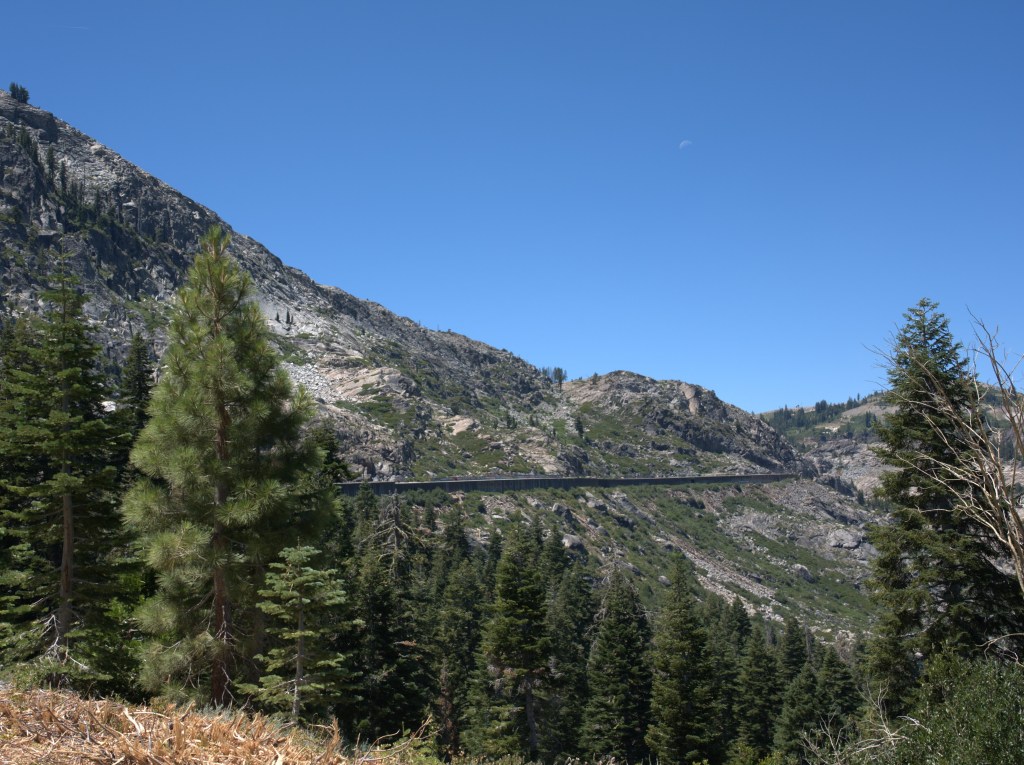 Most hikers turn back after emerging from the last snow shed – after 3 miles of walking on that rough gravel trail. staring at the ground in front of your feet in the dark to avoid tripping on rocks, and going blind going in and out of dark tunnels to bright sunlight, I had little enthusiasm for wandering down a dusty trail or hiking up higher. I was hoping there would be a couple of big rocks to sit on while taking in the view of Donner Lake, but there was not place to rest other than going back into the tunnel entrance. You’d think someone would have built a few benches! At least there was a path heading into some trees if you needed a bio break.